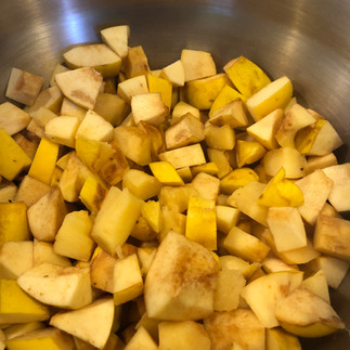 First core and chop the hard, dry fruit. No need to peel. Add 1"- 2" water or apple cider to the pan to prevent fruit from burning as it begins cooking. Gently bring quince to a slow boil then turn to medium low heat and cook 2-3 hours. As the paste thickens reduce heat and stir consistently to prevent scorching. (You can stop midway, reheat and begin again later if needs be. This is a regular practice in traditional jam making allowing the fruit to give itself to the process without excessive heating. Once the fruit cooks for a couple hours the anthocyanins are activated and the paste turns a beautiful pink or red color.